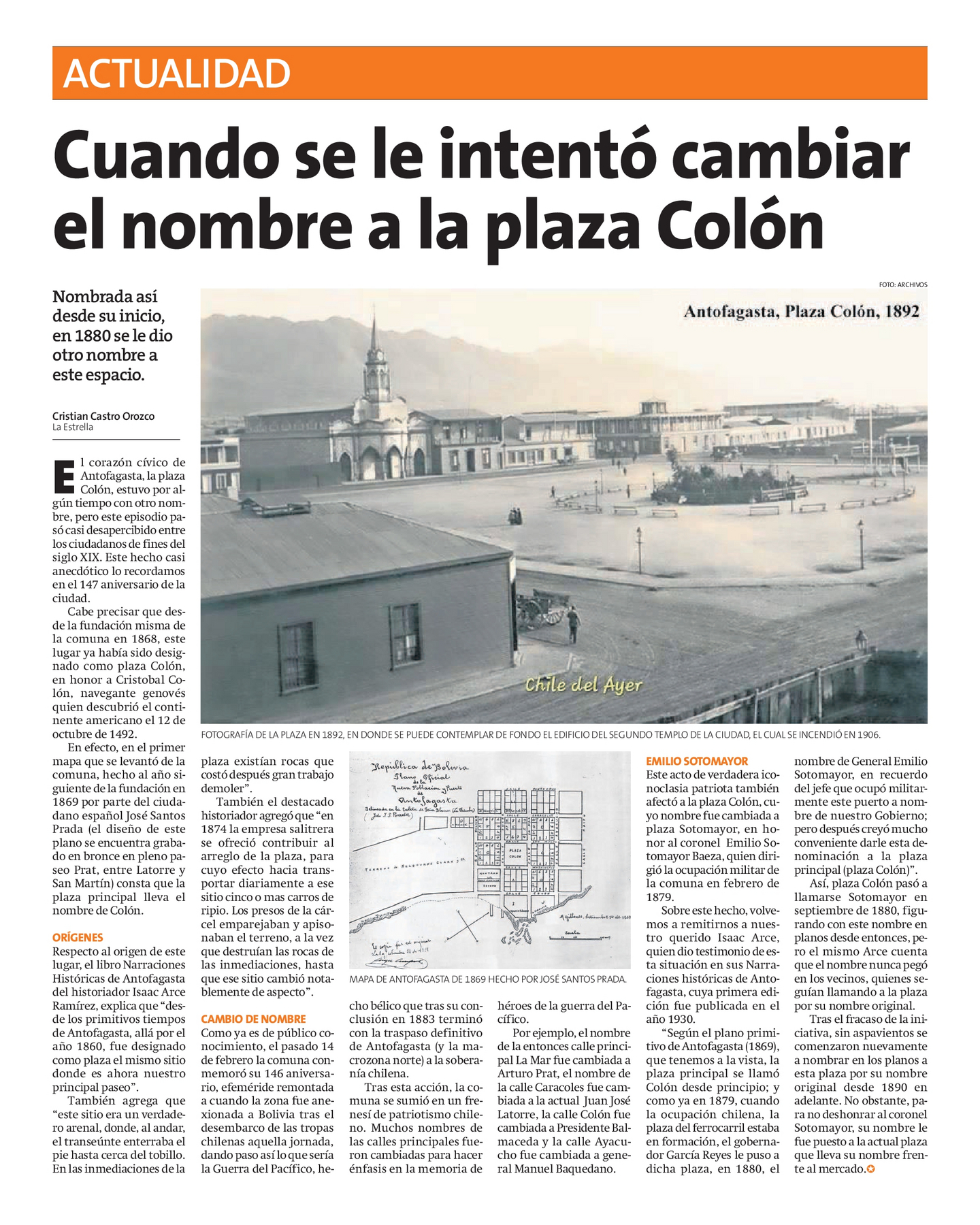El corazón cívico de Antofagasta, la Plaza Colón, designada desde la fundación de la comuna en 1868, no siempre tuvo la forma que posee hoy. En sus orígenes era un arenal intransitable que recién en 1874 comenzó a tomar forma, cuando la empresa salitrera financió arreglos y decenas de presos de la cárcel fueron obligados a apisonar el terreno y destruir sus rocas.